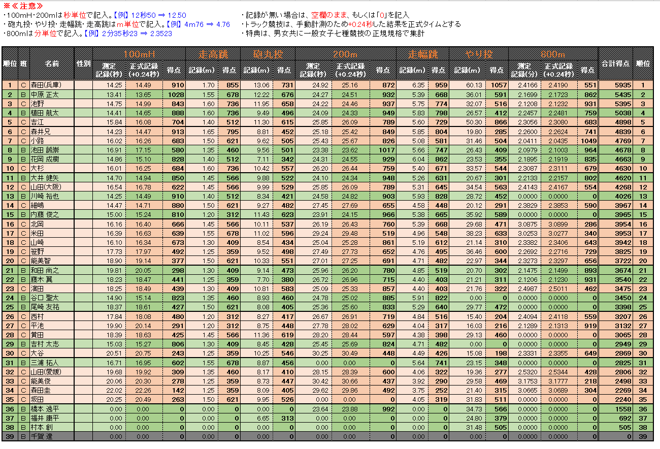 第1回 7種競技in尼崎2015集計表(EXCELダウンロード)